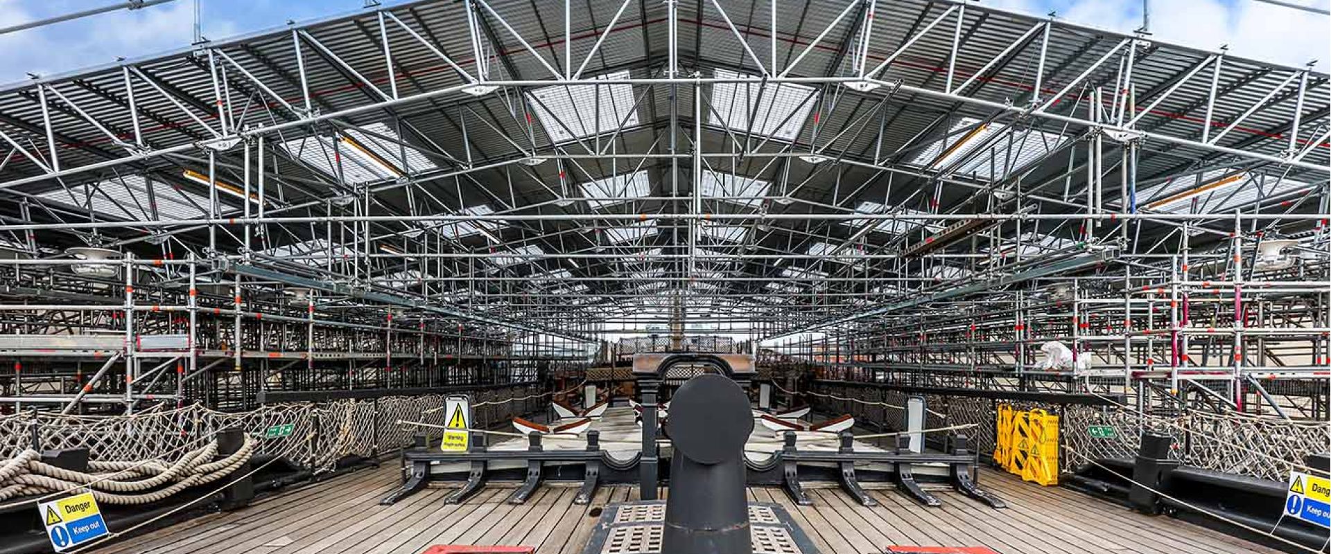 The conservation of HMS Victory, the Royal Navy’s most celebrated warship, required a fully enclosed scaffold structure to protect the vessel during an extensive programme of repair. The project presented unique heritage sensitivities: the ship itself is a scheduled ancient monument with fragile historic timbers, while the surrounding dockyard is also listed. Public access to the vessel had to be maintained throughout, meaning safety, visitor flow, and protection from the elements were all critical.