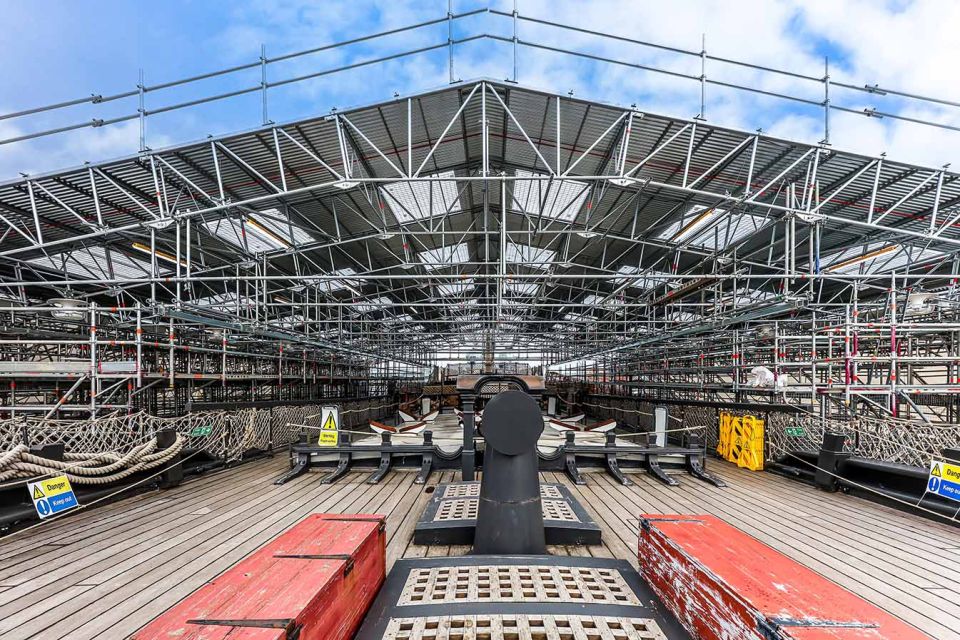 The conservation of HMS Victory, the Royal Navy’s most celebrated warship, required a fully enclosed scaffold structure to protect the vessel during an extensive programme of repair. The project presented unique heritage sensitivities: the ship itself is a scheduled ancient monument with fragile historic timbers, while the surrounding dockyard is also listed. Public access to the vessel had to be maintained throughout, meaning safety, visitor flow, and protection from the elements were all critical.
